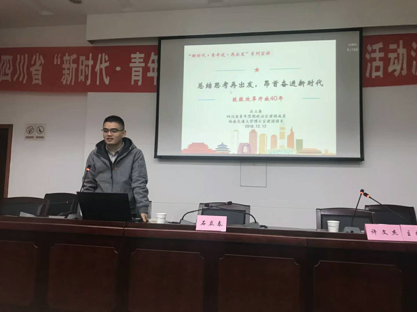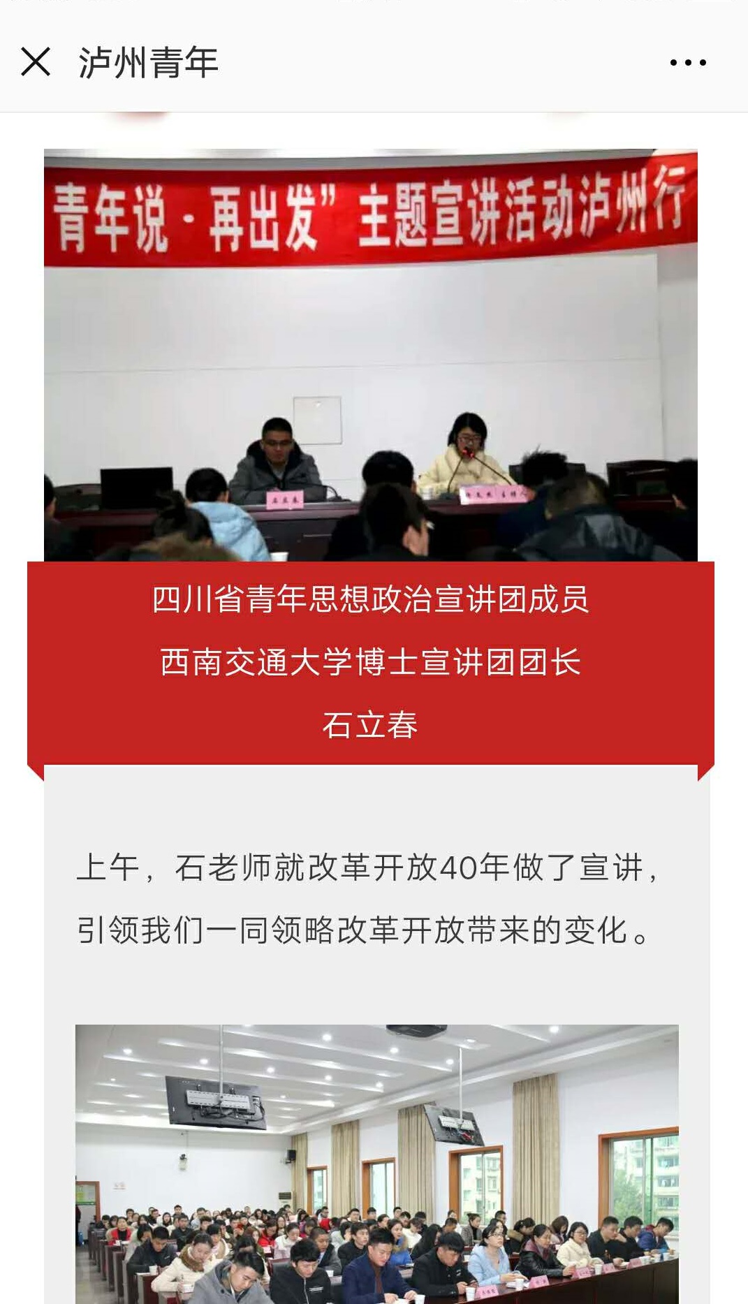 12月12日9:00-11:30,四川省青年思想政治宣讲团泸州行第一站来到了纳溪区,四川省青年思想政治宣讲团成员、午夜av 博士宣讲团团长石立春老师进行题为《总结思考再出发,昂首奋进新时代》的宣讲。此次宣讲在纳溪区委大礼堂,吸引了来自泸州国家高新区纳溪科技园和泸州纳溪经济开发区的众多企业青年,还有镇街道团委书记、副书记,农村青年代表等。宣讲活动由泸州市纳溪区团委副书记许文杰主持。