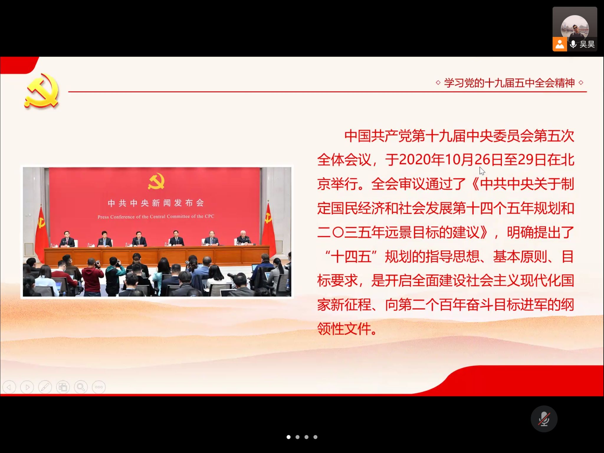为坚定青年理想信念,激发青年使命担当,思想政治教育2019-02团支部于2020年12月10日下午,通过线上会议的方式开展学习党的十九届五中全会精神主题团日活动。活动由团支部书记吴昊同学主持,思想政治教育专业2019-02团支部全体成员均准时与会。