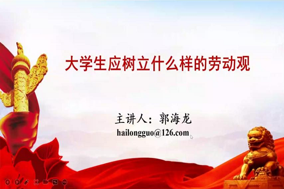 郭海龙副教授主讲。郭老师从劳动要素方面的新变化和新特征、劳动的价值、大学生该怎么做三个方面对大学生进行劳动观教育,解释了什么是劳动观、树立什么样的劳动观、怎样树立劳动观等问题,由宏观到微观、从理论到实践,全面系统的讲解让同学们受益匪浅。