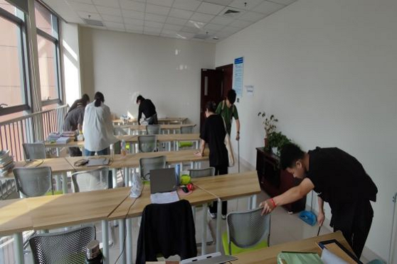 自习室开展了清洁活动。大家各自分工,对地面、桌椅、书架等进行了清理打扫。