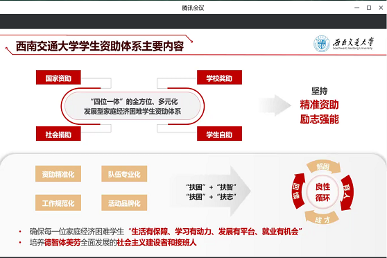学生资助项目两个方面具体阐释了学生资助体系的主要内容,并从意义、对象和原则三方面深入浅出地为同学们讲解了家庭经济困难学生的认定工作。家庭经济困难的认定是资助工作的前提与基础,是实现精准资助和做好学生工作的必然要求,是确保资助政策有效落实的迫切需要。随后,宣讲员详细介绍了申请各类奖助学金的流程,并发出呼吁,倡导同学们砥砺奋发、努力拼搏,全面掌握资助政策,发扬交大精神,做自信自强的交大学子。