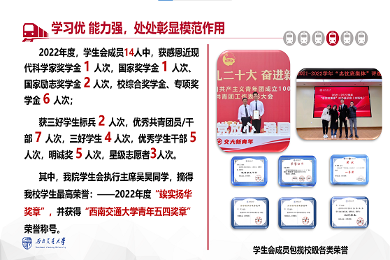 学生会聚焦时代热点,把握时代脉搏,深入学习贯彻习近平总书记系列重要讲话精神,坚持政治引领,强化理想信念,发挥榜样效应,树立楷模意识,以服务学生为中心,加强从严治会,提升工作效率,顺利举办“我心中的那抹红”主题朗诵比赛等活动。