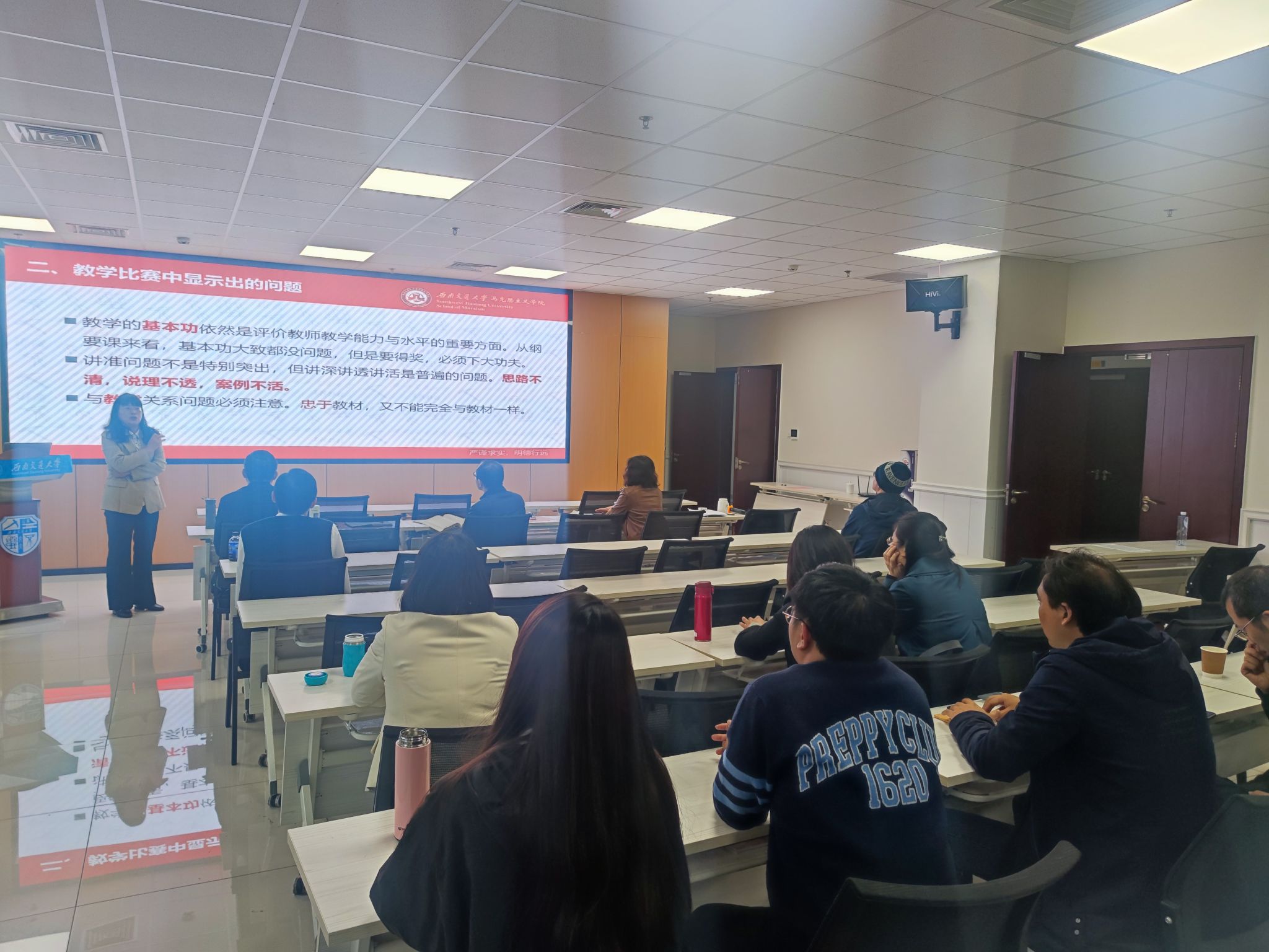 谢瑜副院长以自己曾参加省赛并多次担任省赛评委的亲身经历,就提升教学能力,讲好思政课,分享了自己的经验体会。她指出,一是要充分认识教学与比赛的关系,既要积极参与比赛,以赛代练进一步提升教学水平;又要注重平时训练和把功夫花在日常,增强参赛的底气和信心;二是要从问题意识、时政前沿、理论基础、因材施教、教学设计五个方面进行着手,有章法,有重点,精心准备;三是要在平时教学中多修炼内功、不断超越,不断地挑战自己和突破自己的极限。