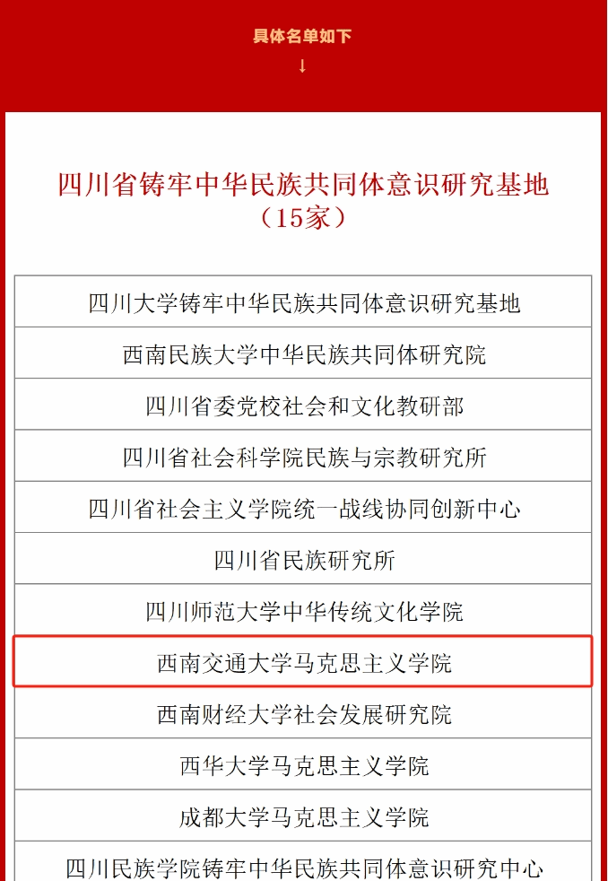 近日,四川省委统战部、省委宣传部、省教育厅、省民族宗教委联合印发《关于命名全省铸牢中华民族共同体意识研究(培育)基地(2023—2025年)的通知》,决定命名全省首批铸牢中华民族共同体意识研究(培育)基地,经过公开申报、联合筛选、实地考察等程序,在午夜av
