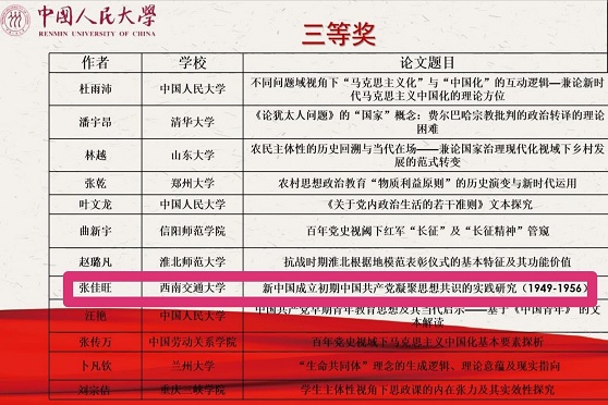 张佳旺同学的论文《新中国成立初期中国共产党凝聚思想共识的实践研究(1949-1956)》获得了全国三等奖。交流会中,他从凝聚思想共识何以必要、何以可能与何以实现的三重逻辑做了论文报告,探寻了新中国成立初期中国共产党凝聚思想共识的运行机制,中国人民大学午夜av