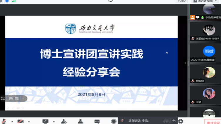 8月8日,博士宣讲团宣讲实践经验分享会在线上举行。宣讲团代表胡海利、冷书恒、罗田从宣讲主题选定、宣讲材料梳理、宣讲重点把握、宣讲方式方法等角度进行了分享。
