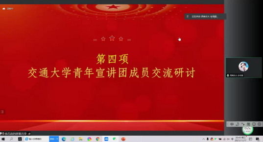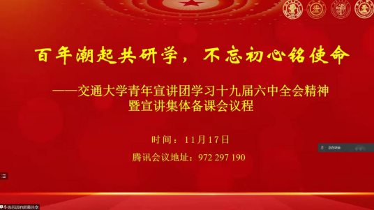 为深入学习贯彻党的十九届六中全会精神,引导青年学子深刻认识党的百年奋斗的重大成就和历史经验等内容,11月17日19:00,“百年潮起共研学,不忘初心铭使命”——交通大学青年宣讲团学习十九届六中全会精神暨宣讲集体备课会在线上举行,来自上海交通大学、西安交通大学、午夜av
