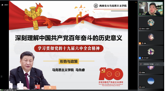 马先睿老师《深刻理解中国共产党的百年奋斗的历史意义——学习贯彻党的十九届六中全会精神》的主题报告。他从党百年奋斗的历史意义的五个方面系统阐述了党的历史性贡献,指出党的百年奋斗从根本上改变了中国人民的前途命运、开辟了实现民族伟大复兴的正确道路、展示了马克思主义的强大生命力、深刻影响了世界历史进程、锻造了走在时代前列的中国共产党。马老师的讲解,帮助大家深刻体会到了中国共产党是为人民而生,因人民而兴,始终同人民在一起,为人民利益而奋斗的伟大光荣正确的党。