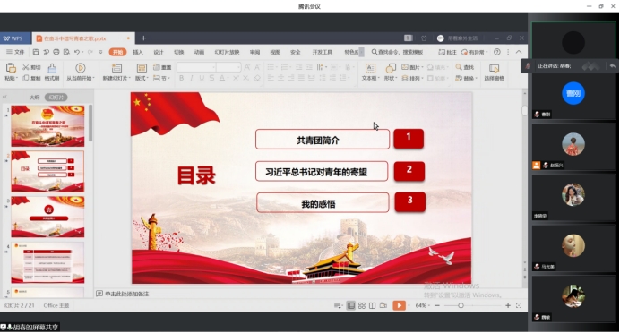 胡春同志以《在奋斗中谱写青春之歌 ——庆祝中国共青团成立100周年》为题,以习近平总书记在庆祝中国共产主义青年团成立100周年大会上的重要讲话为基,从“共青团简介”“习近平总书记对青年的寄望”“我的感悟”三个方面深入梳理了共青团诞生及发展的历史脉络、论述了习近平总书记对青年的谆谆教诲和殷切期望、表达了自己对习近平总书记深切寄望学习领悟的心得和对自身成长进步的反思,既带领支部同志了解学习了共青团的有关知识和习近平总书记对青年的寄望,又结合自己的所思所想引起其他支部同志深思。