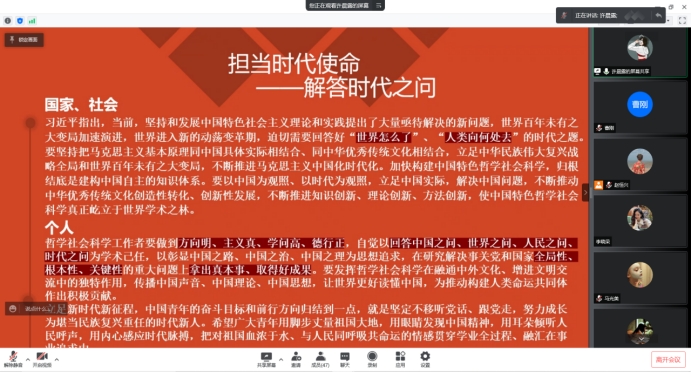 2020级硕士研究生党支部开展学习贯彻习近平总书记重要讲话精神主题党日活动,学习贯彻习近平总书记重要讲话精神。党日活动分享聆听了许晨露、胡春、赖伟三位同学关于学习习近平总书记重要讲话精神和自身成长发展的心得体会,讨论通过了支部组织生活会学习分组名单。本次活动由党支部纪律检查委员赵恒兴同志主持,支部全体党员和积极分子参加。