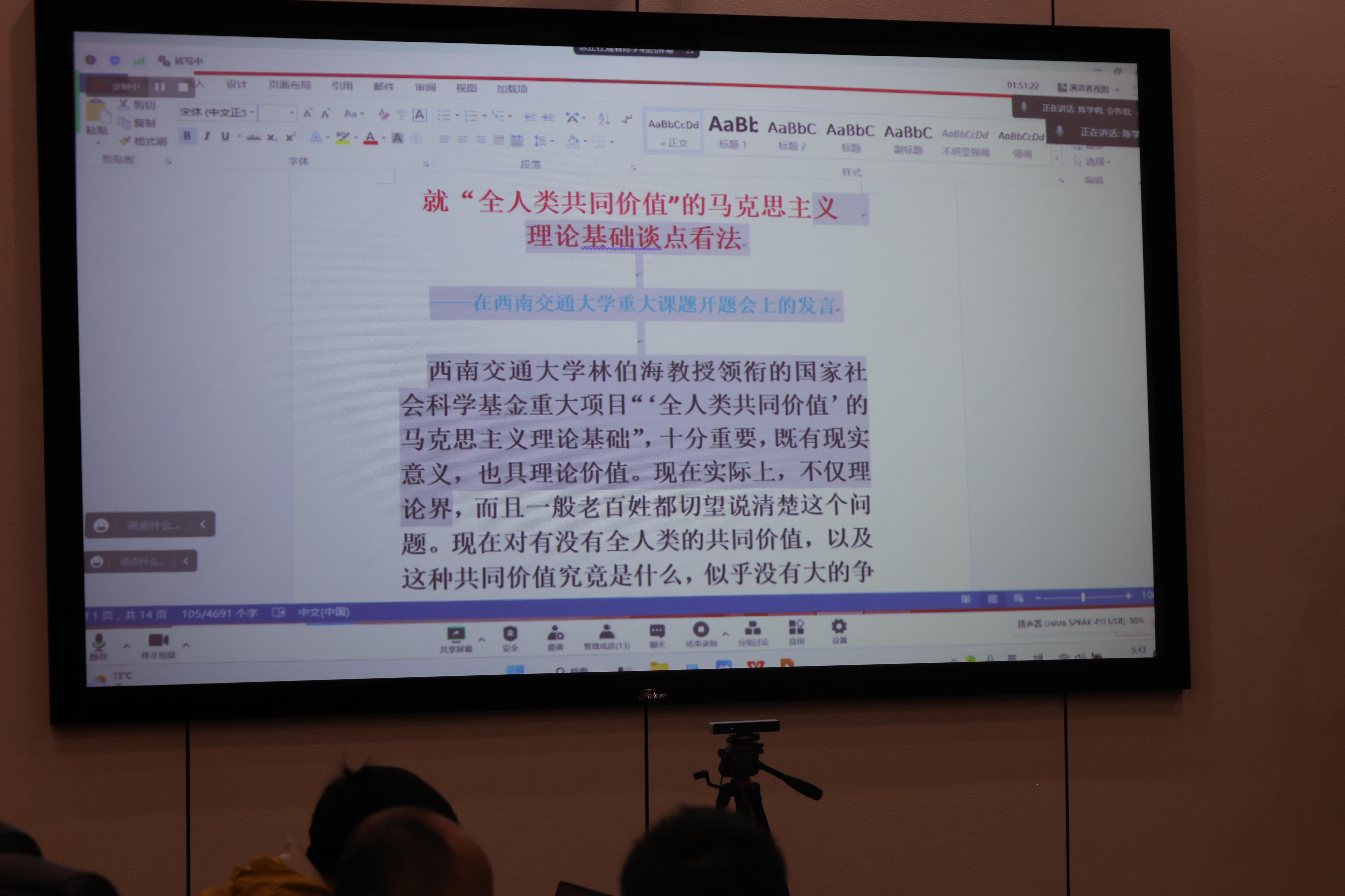 林伯海教授做开题汇报,复旦大学陈学明教授、山西大学马俊峰教授、北京大学孙来斌教授、东北大学田鹏颖教授、北京大学陈培永教授、武汉大学项久雨教授做主题发言,开题会以线上、线下相结合的方式进行。