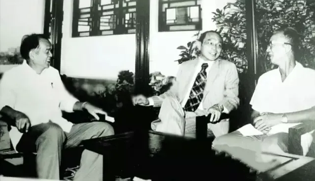 霍英东(中)和佘畯南(右)、莫伯治(左)在一起研究白天鹅宾馆的建设和设计问题