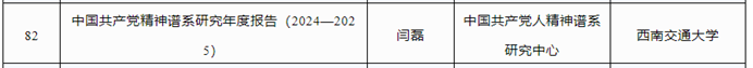 2024年10月22日,四川省哲学社会科学规划办公室对本年度四川省哲学社会科学重点研究基地学术研究专项资助项目立项情况进行了公示。我中心闫磊老师牵头申报,肖云峰和黄静同学参与的《中国共产党人精神谱系研究年度报告(2024—2025)》获批立项公示。具体情况如下: