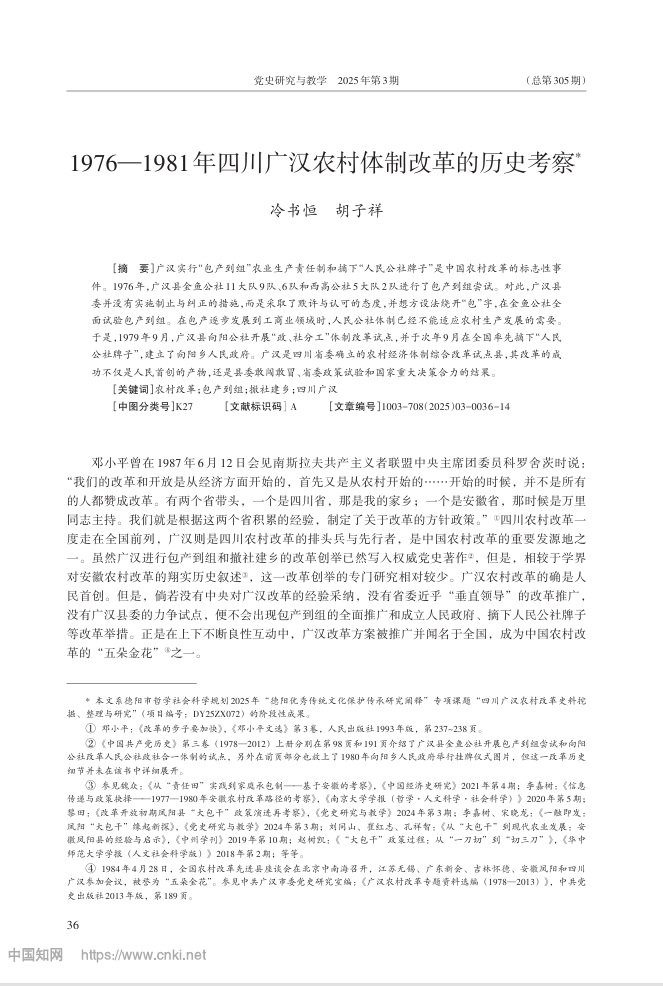 【科研论文】冷书恒,胡子祥. 1976—1981年四川广汉农村体制改革的历史考察 [J]. 党史研究与教学, 2025, (03): 36-49.