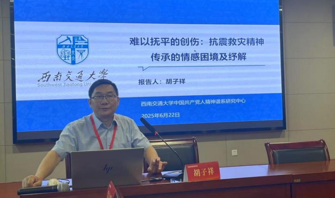 胡子祥教授以《难以抚平的创伤:抗震救灾精神弘扬的情感困境及纾解之道》为题,聚焦弘扬抗震救灾精神可能引起的情感困境、产生原因、纾解之道三方面作主题发言。他认为,抗震救灾精神弘扬过程可能再一次揭开亲历者的“伤疤”,再现生命逝去的悲痛、回忆灾难的恐惧,这与缺乏创伤叙事、媒介传播、纪念活动等方面的伦理考量息息相关。他强调,新时代弘扬抗震救灾精神要践行尊重自主、不伤害和有利等生命伦理原则,树立“三因制宜”的理念,从心理、教育、宣传、技术等方面构建协同干预的纾解之道。