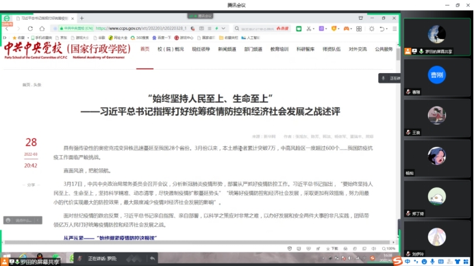 近期全国本土聚集性疫情呈现点多、面广、频发的特点,成都市也相继出现了确诊病例和无症状感染者,校园疫情防控形势严峻复杂。根据午夜av 午夜av 要求,为进一步增强学生疫情防控意识、筑牢校园疫情防控防线,午夜av 2020级硕士研究生党支部4月14日下午组织开展了“携手同心 共守校园”线上主题党日活动。本次会议由党支部书记罗田同志主持,支部全体党员、发展对象以及积极分子参与。