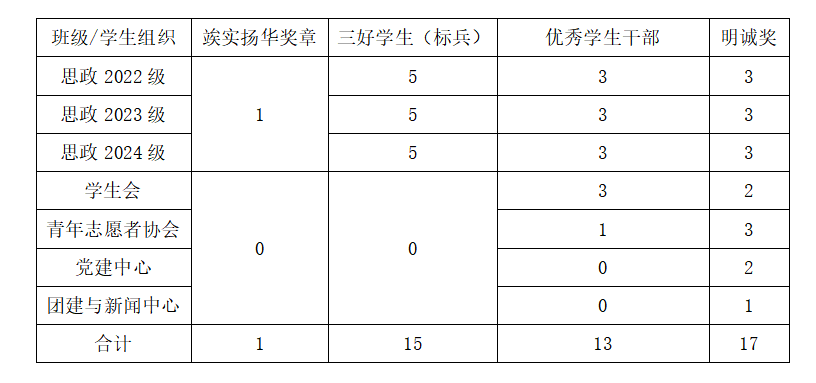 4.同一学年内“三好学生标兵”、“三好学生”、“优秀学生干部”、“明诚奖”不可兼得;“忠忱班集体”、“先进班集体”、“特色班集体”不可兼得。