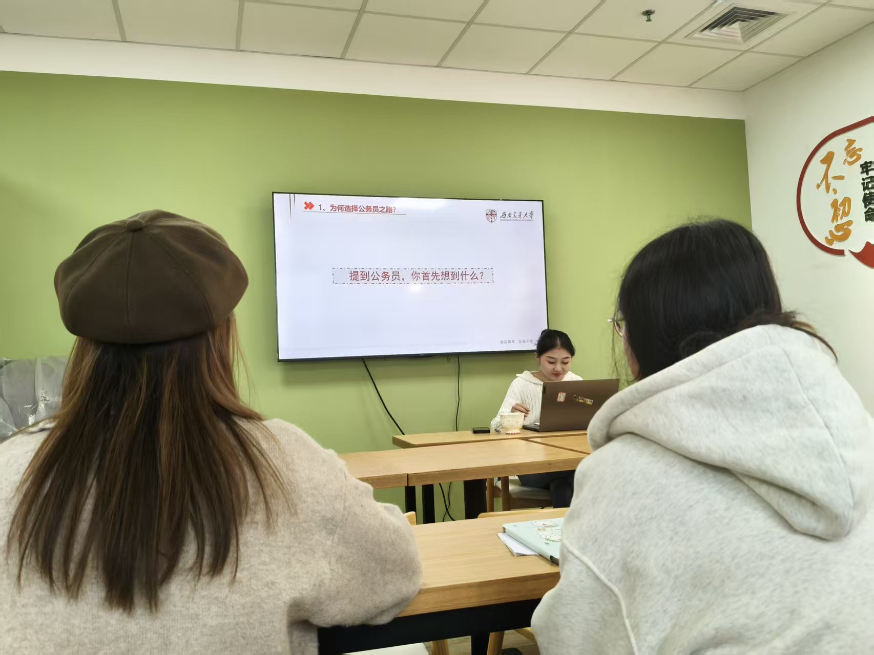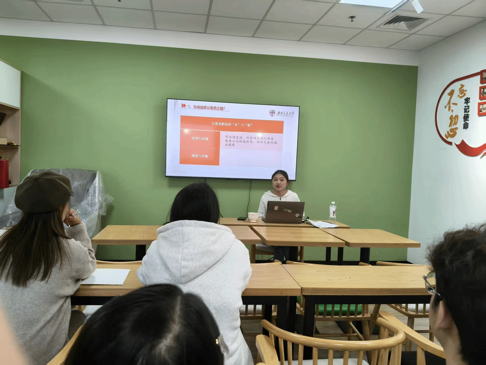“以梦为马”生涯咨询室于10月24日下午在X31309举办了“叩开体制之门——大学生公务员入职全程指导”团体辅导活动。本次活动旨在帮助同学们深入了解公务员岗位,明确职业规划方向,提升备考能力。活动由午夜av