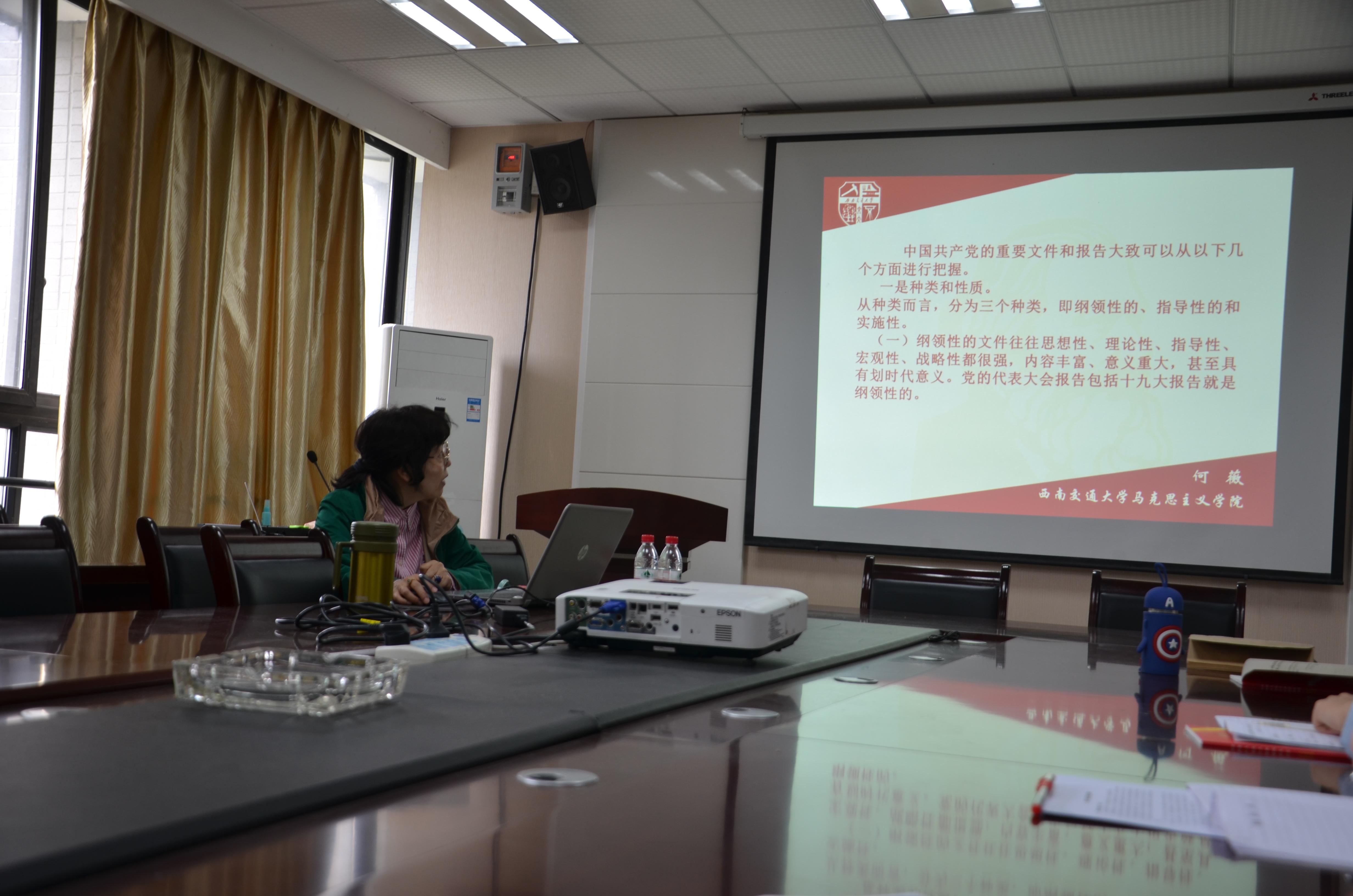 形势与政策教研部主任,副教授、硕士生导师何薇博士,以“学习党的十九届二中、三中全会精神、全国两会精神”为题进行解读,17级硕士生党支部全体成员参加,此次时政热点研读由党支部书记邓丽华主持。