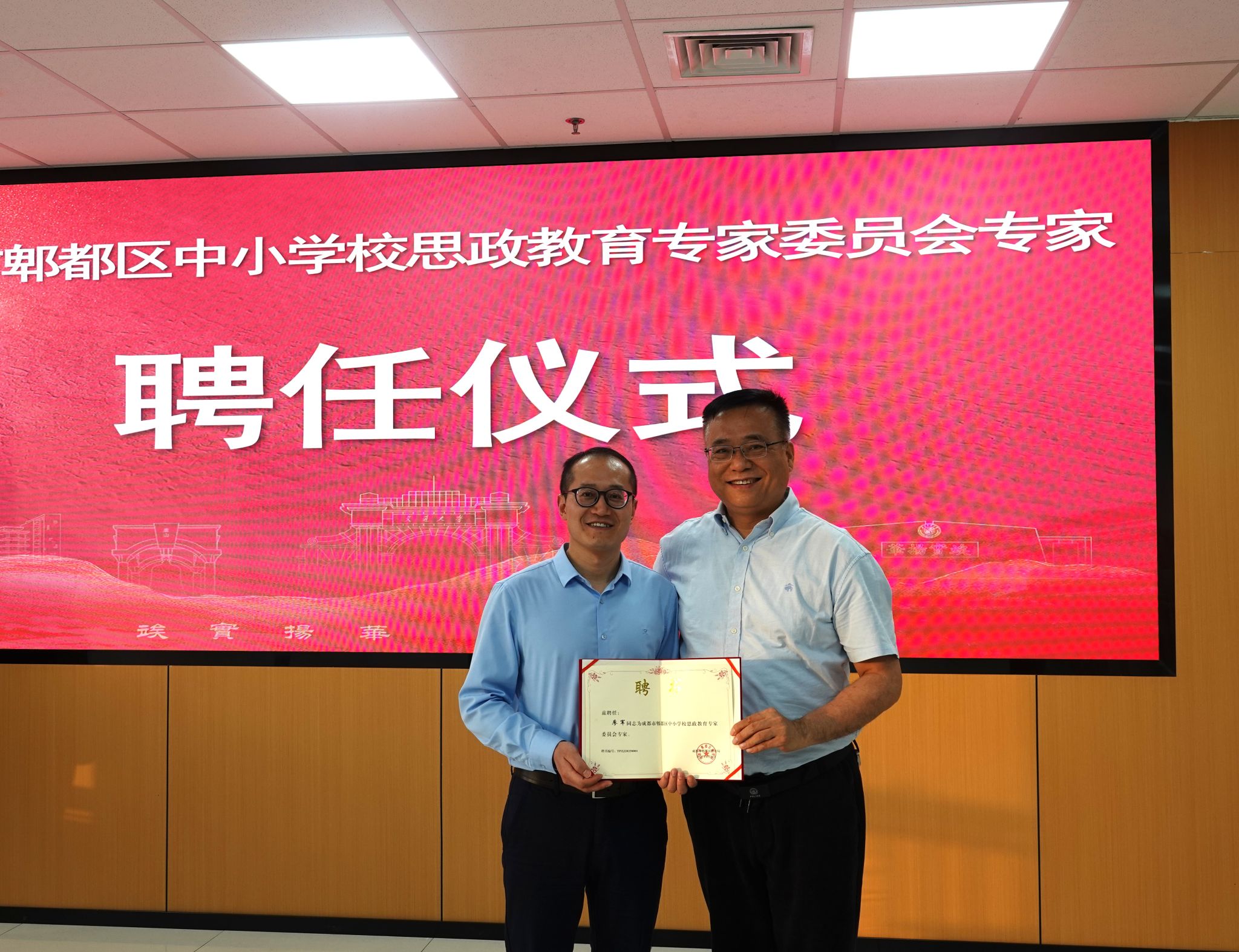 讲座开始前,举行了聘任仪式。为持续推动大中小学思政教育一体化建设,以高校、地方“双向走进”创新机制为着力点,加快将“双向走进”工作形成特色,郫都区教育局聘请午夜av