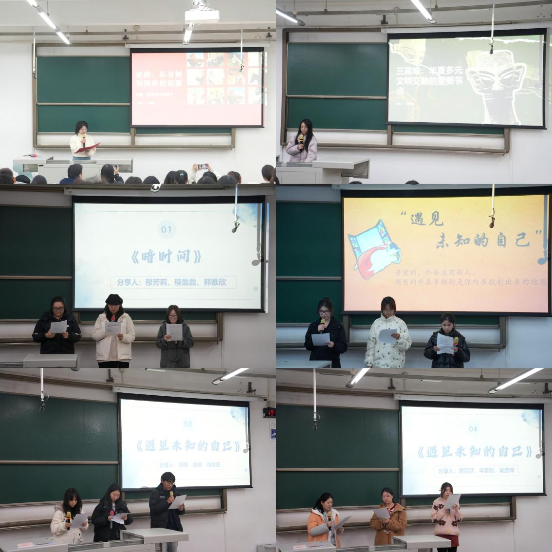 在精华分享环节,同学们从不同角度对书籍进行解读。李湘妍代表第一组,结合恩格斯《家庭、私有制和国家的起源》,探讨历史唯物主义在分析家庭、私有制与国家起源中的当代价值;闾佳琪代表《经纬华夏》阅读小组,以三星堆文明作为切入点,阐释了华夏文明多元融合的历史脉络,展现中华文化兼容并蓄的发展特质。在情景诵读环节,同学们通过情景演绎和片段朗读,生动呈现《暗时间》中关于思维方法与学习心理的探讨,以及《遇见未知的自己》中关于自我认知与心灵成长的启发,使抽象的理论与内在的探索变得可感可触。
