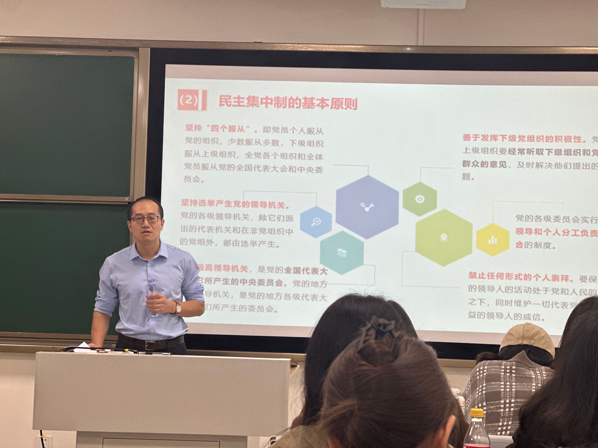 党委副书记邓秀芸也为同学们带来了主题为“中国共产党党员的义务与权利”的课程。邓秀芸详细解读了作为一名党员应当履行的义务以及享有的权利,让每位学员更加明确自己肩负的责任与使命。离退休党支部的徐文生老师还特别为大家进行了“中国共产党的诞生”党史专题教育,深化了同学们对自身使命与担当的认识,杨伟宾和刘玉标老师分别以“中国特色社会主义”“中国共产党的性质、宗旨和最高理想”为题,让同学们在切实提高自身理论水平和政治素养的同时感受自身时代责任和要求。