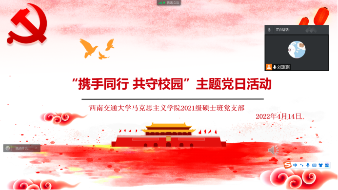 为进一步做好疫情防控工作,守护学生身体健康和生命安全。4月14日晚上8302021级硕士班党支部在线上开展“携手同行 共守校园”主题党日活动。会议由纪检委员穆春凤同志主持,2021级硕士班党支部全体党员参加。