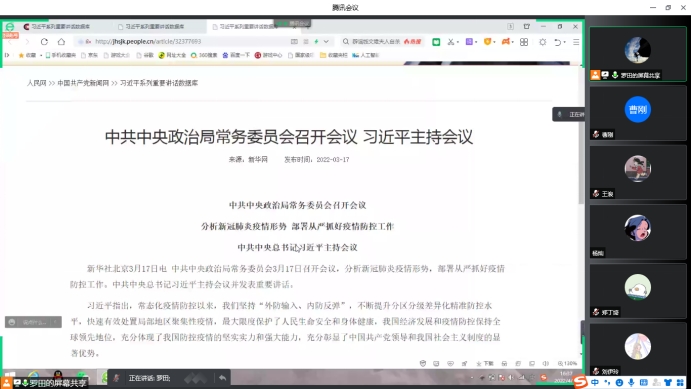 首先,罗田同志带领支部全体同志认真学习了3月17日召开的中共中央政治局常务委员会“分析新冠肺炎疫情形势 部署从严抓好疫情防控工作”会议精神和《始终坚持人民至上、生命至上——习近平总书记指挥打好统筹疫情防控和经济社会发展之战述评》文章,再次要求支部党员同志正确认识当前疫情防控形势,绷紧校园疫情防控这根弦,坚决服从午夜av 午夜av 疫情防控工作安排,严格遵守校园疫情防控纪律,积极发挥党员先锋模范作用,自觉配合午夜av 疫情防控工作。
