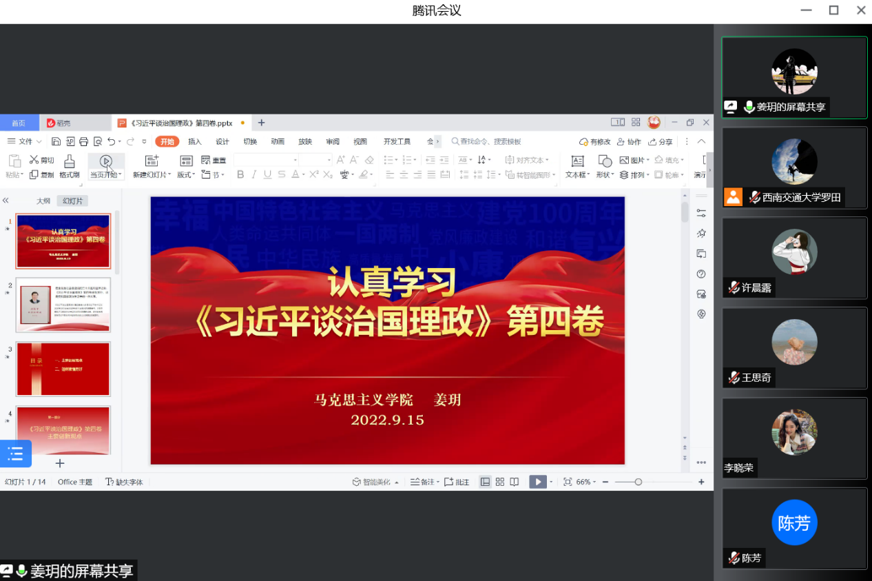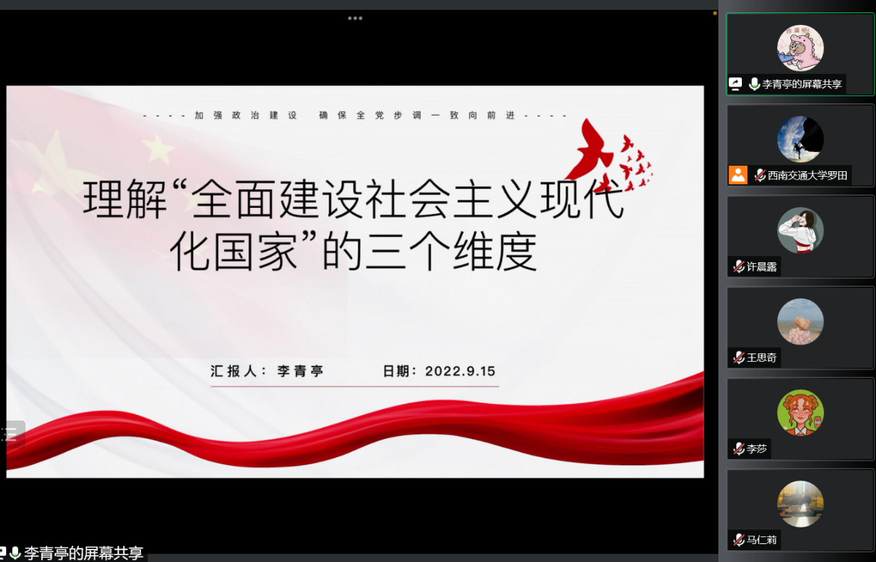 2020级硕士研究生党支部召开线上组织生活会,按照既定组织生活会学习分组名单,聆听了李青亭、姜玥、陈芳三位同志关于学习习近平新时代中国特色社会主义思想的心得体会。本次会议由党支部书记罗田同志主持,支部全体党员参加。