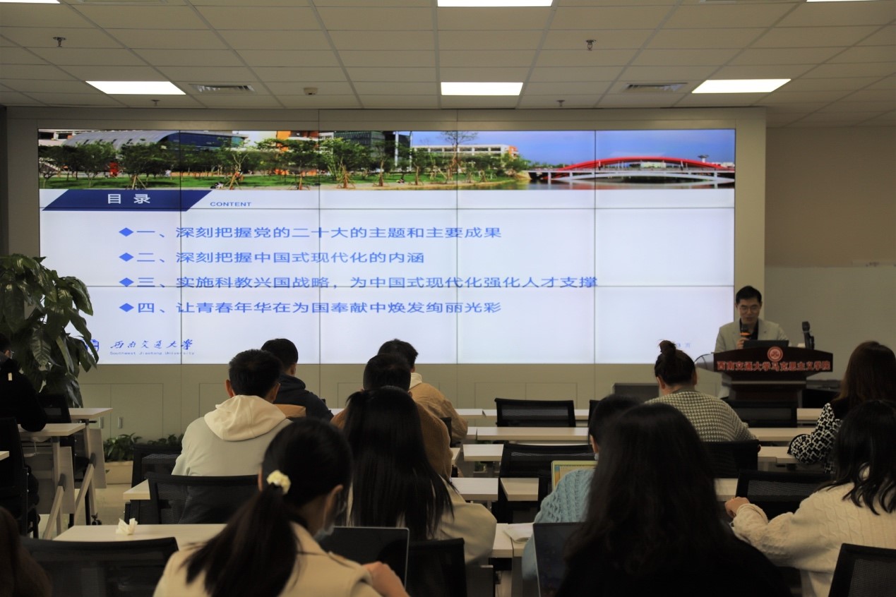 杨桓副教授以学习宣传贯彻党的二十大精神为题,从深刻把握党的二十大主题和主要成果、深刻把握中国式现代化的内涵、实施科教兴国战略,为中国式现代化强化人才支撑、让青春年华在为国奉献中焕发绚丽光彩四个方面进行了精彩讲解。在具体解读党的二十大精神核心内容的基础上,杨桓副教授以生动有趣的现实案例和自身求学经历为讲解素材,给与会党员同志开展了一场集学习与生活智慧于一体的思想盛宴。最后,他在讲解关于科教兴国战略实施过程中培养什么人、如何培养人的问题时,谈到了当前研究生压力大、容易焦虑的现实问题,对此进行了原因分析,从立大志向、打开格局、警惕平淡、直面挑战、进入正向循环等几个方面为研究生们提供了一些建议,让在场党员同志受益颇丰。