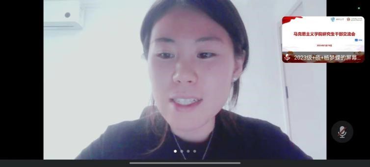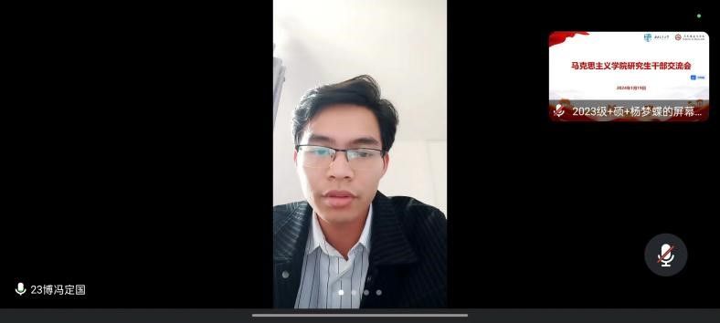 接着,进入研究生干部发言交流环节。2021级博士班班长冷书恒对本学期学生工作进行总结,交流了学习上的问题。2023级硕士班团支部书记王呈剑从生活和学习两个方面开展交流,午夜av