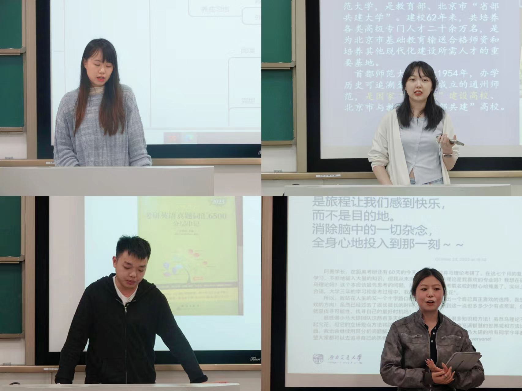 左珈弋同学分享了备考浙江大学的宝贵经验,重点向同学们介绍了考研英语学习方法。左珈弋同学从前期、中期、后期三个阶段细致入微地向同学们分享了全过程考研英语学习要点,给同学们提供备考英语的系统性方法;马祎涵同学重点以自身择校经历,给同学们提供了考研择校的多方面的思路与方法,让同学们了解到更多考研择校的注意事项;赵鹏同学以轻松的交流方式,分享了备考的复习经验,提供了丰富的考研复习资料,对考研复习资料的选择与使用给出了详细的介绍;古璨同学重点分享跨专业备考经验,鼓励同学们找寻自身真正兴趣,利用自己的特长与兴趣爱好选择考研专业,合理规划自身未来发展。四位优秀考研学子均提出,在考研过程中良好心态是制胜法宝,在分享的最后均鼓励正在备考的同学们坚持不懈,并衷心祝愿同学们一战成硕。在本次活动中,同学们了解到了优秀学长学姐考研的成功经验,积极与分享嘉宾互动,现场氛围轻松活跃。