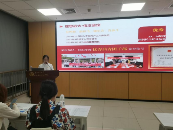 的杨越溪担任主讲人。她分享了自己从青联会活动部干事到会长团成员的成长历程,强调学生干部要以自我提升为一切工作的基础,只有自身具备过硬的素质和能力,才能更好地为同学服务。接着,杨越溪分享了参与竞赛的经验。她提到,自己赛后会根据活动目标,结合专业知识与未来规划为同学们答疑解惑,从而带动大家共同进步。此外,她还分享了自己的志愿服务经历,这些经历不仅为她积累了宝贵的实践经验,更让她明确了今后的工作方向,在服务他人的过程中实现自我价值的提升。