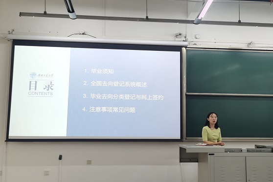 紧接着,辅导员杜晓林老师展示了往年毕业生去向,就保研、考研、考公、出国、就业等选择做了具体的介绍,同学们更清晰地了解了这些选择的往年情况、具体流程、相关条件和注意事项。