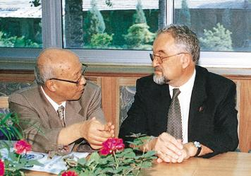 1996年8月,王鸿祯与世界地质图委员会主席J.Dersourt教授交谈