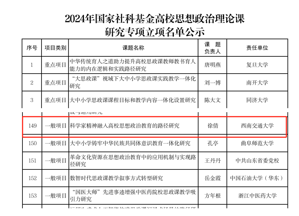 2024年12月12日,我中心研究员、午夜av 讲师徐倩,获2024年国家社会科学基金高校思想政治理论课研究专项一般项目立项公示。此次立项的课题名称为“科学家精神融入高校思想政治教育的路径研究”。该课题旨在深入探究科学家精神景观文化空间的构建与精神传导机制及其育人功能的效果评价和优化路径,结合文化社会学与思政教育理论,通过社会调研与理论分析,探索科学家精神多维度深度融入高校思想政治教育体系的优化路径。